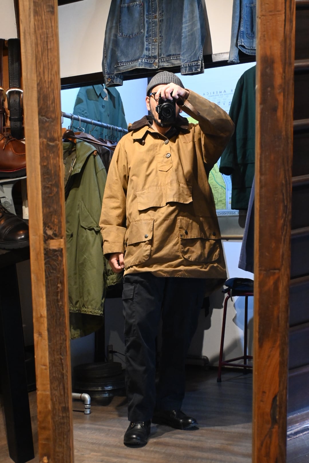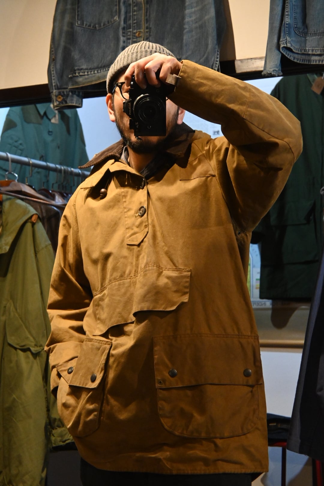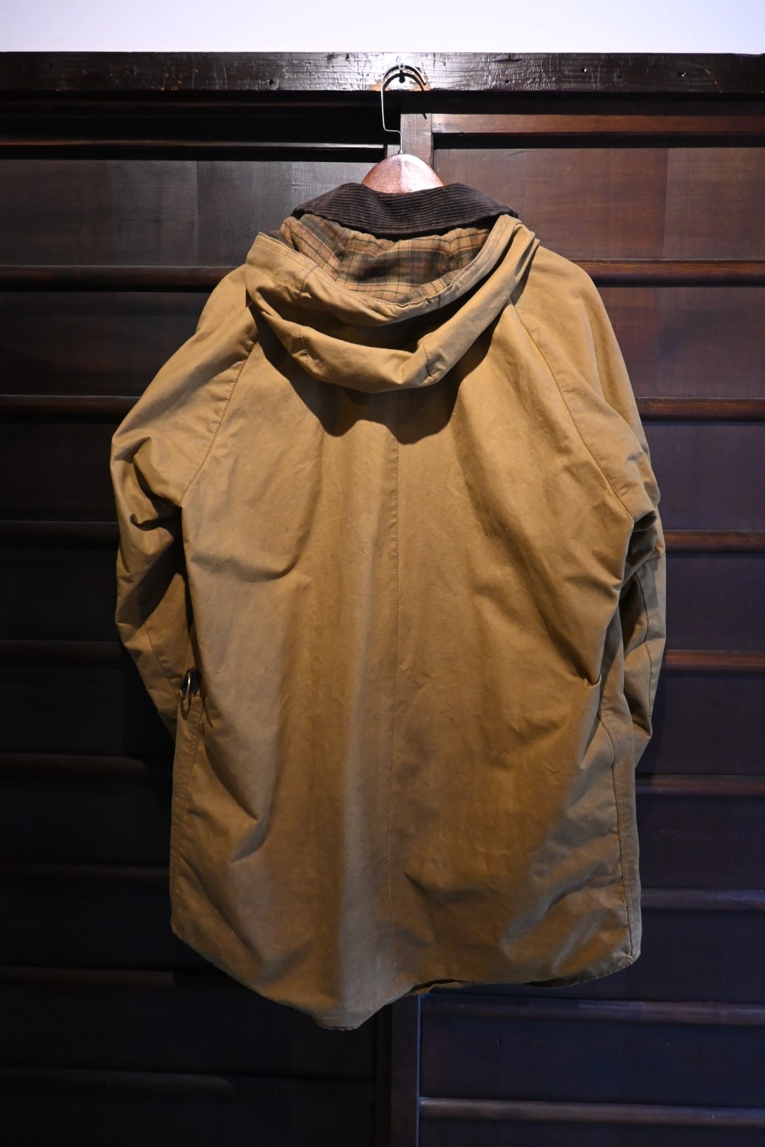 オイルドコットン特有の風合いがしっかり出ており、経年変化、アタリ・色ムラも含めて雰囲気抜群の一着。