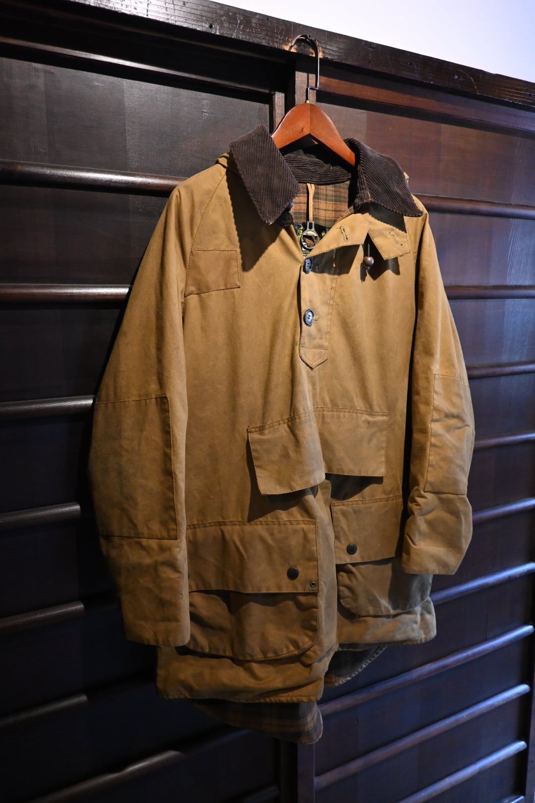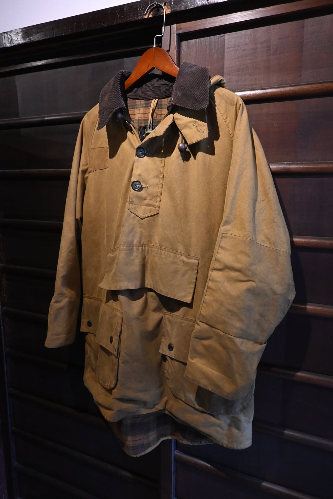 スモックタイプのプルオーバー仕様で、通常のバブアージャケットとは一線を画す希少モデル。フロントの大きなポケットやフード付きデザイン、コーデュロイ襟、タータンチェックの裏地など、クラシックなディテールが魅力です。