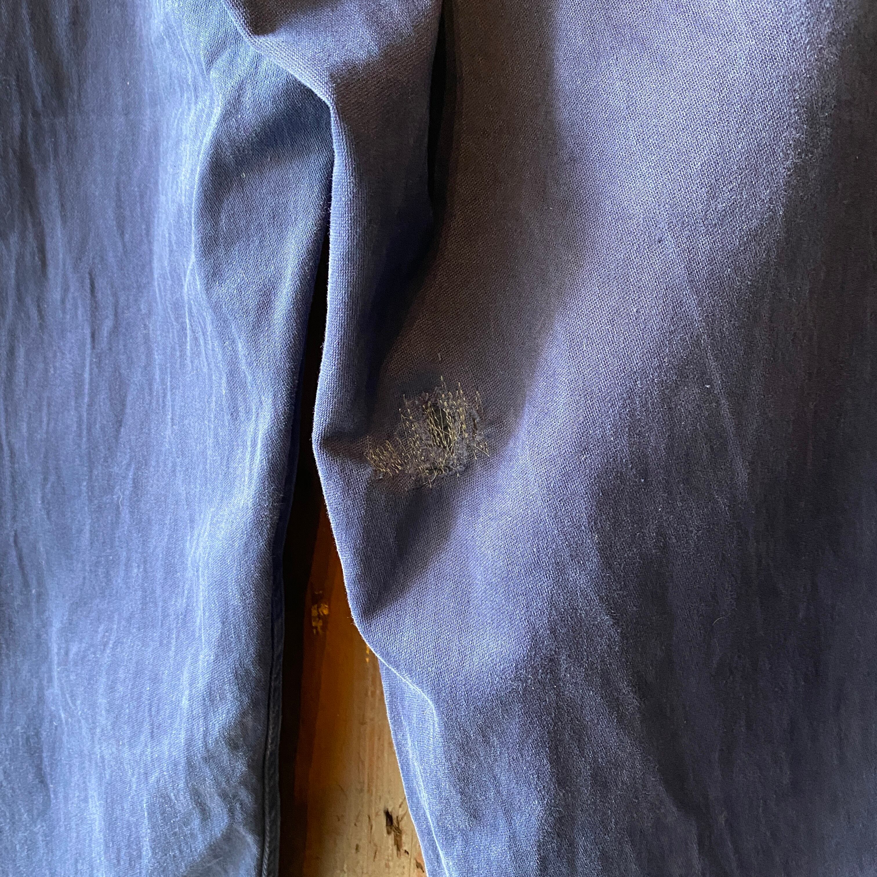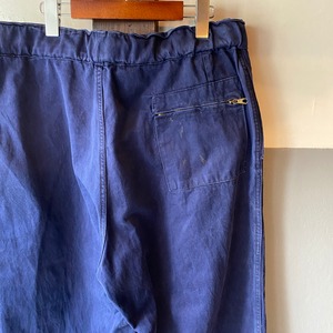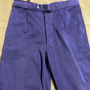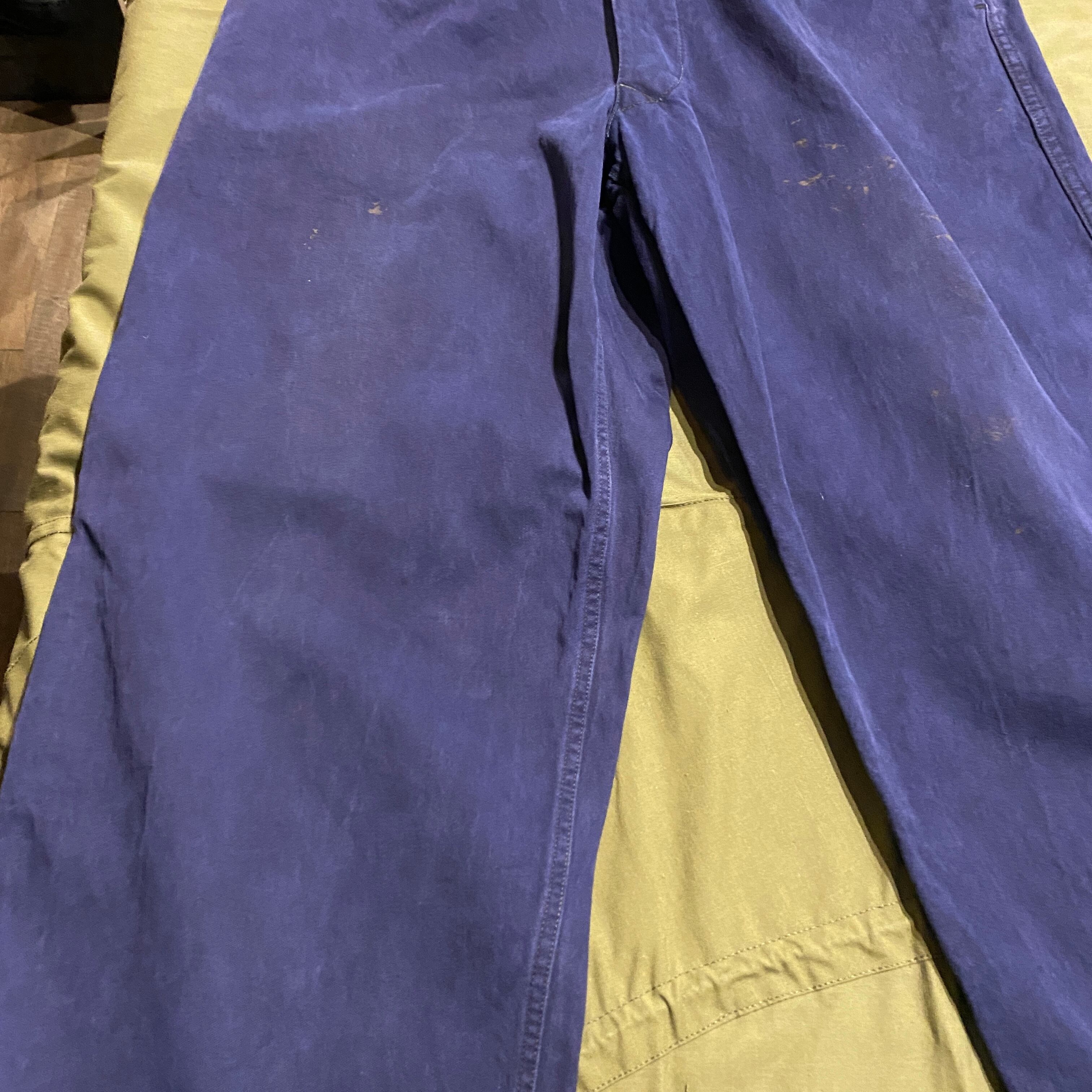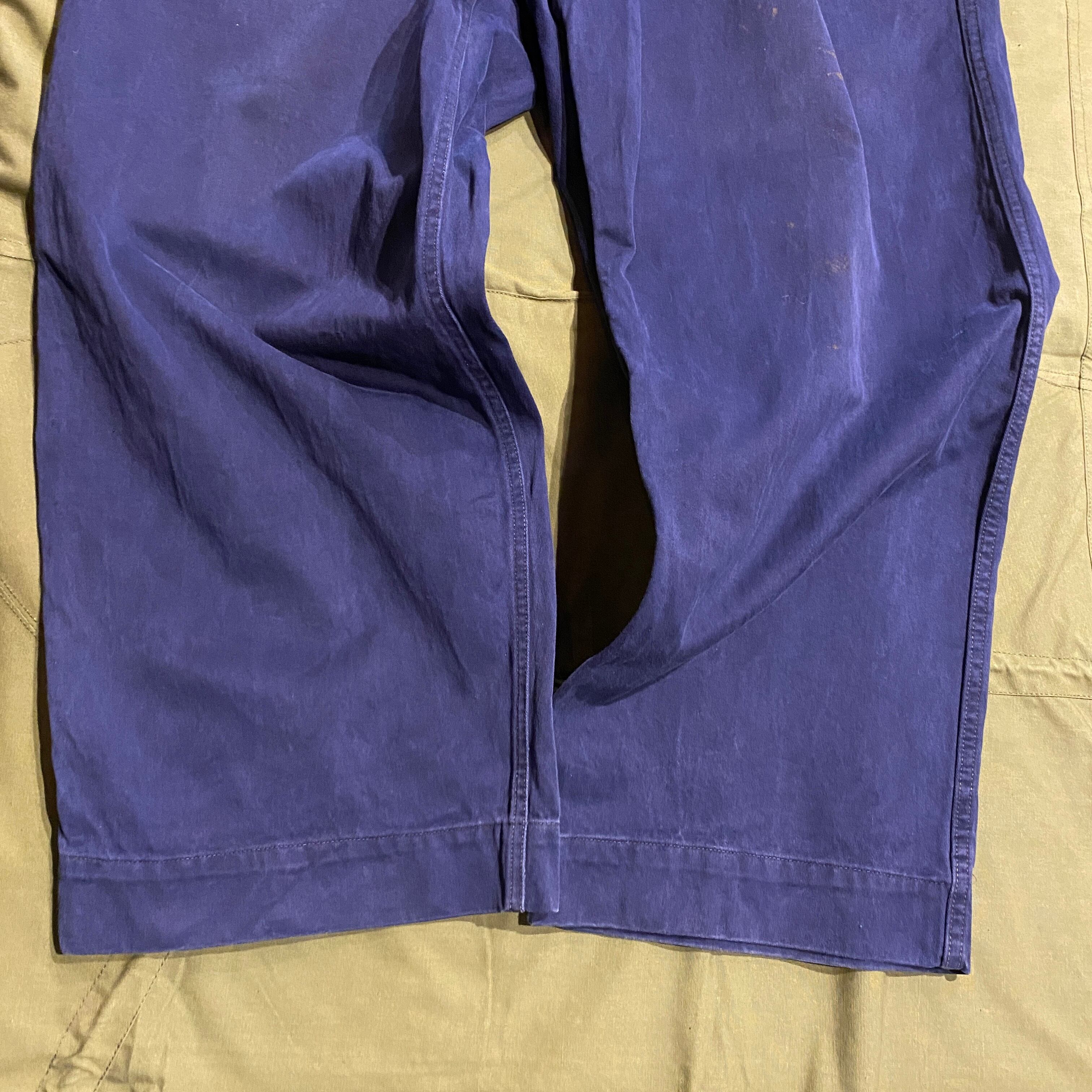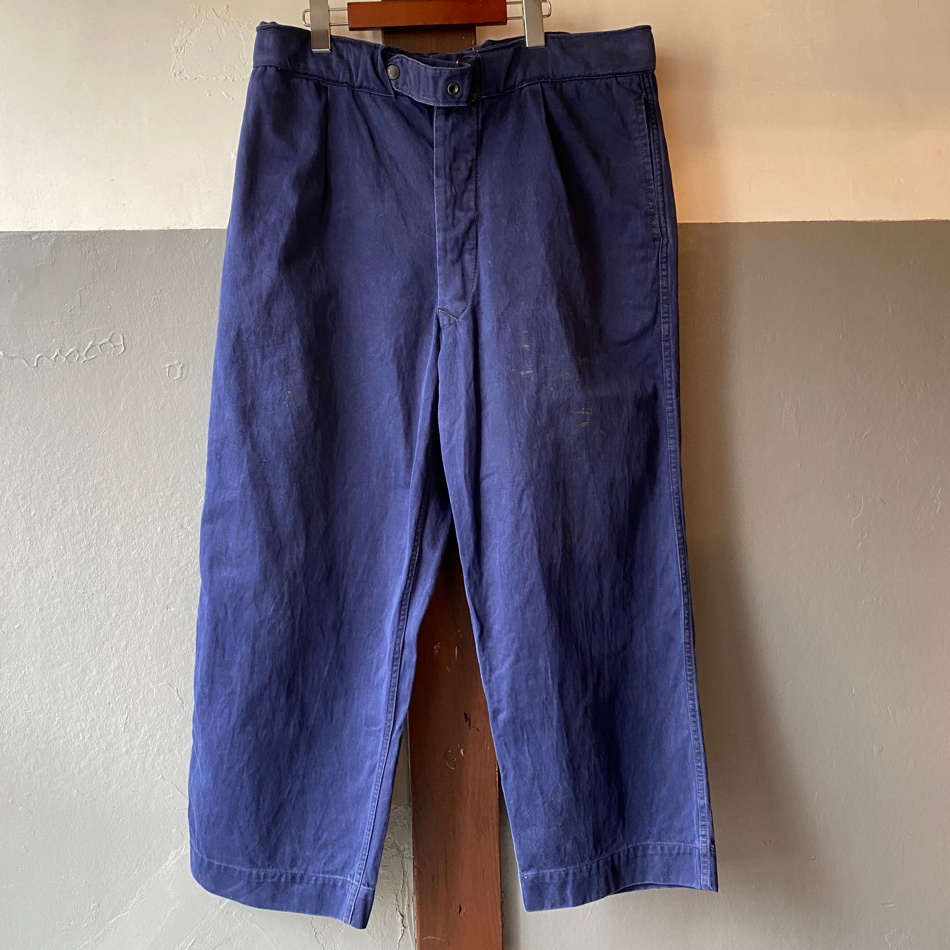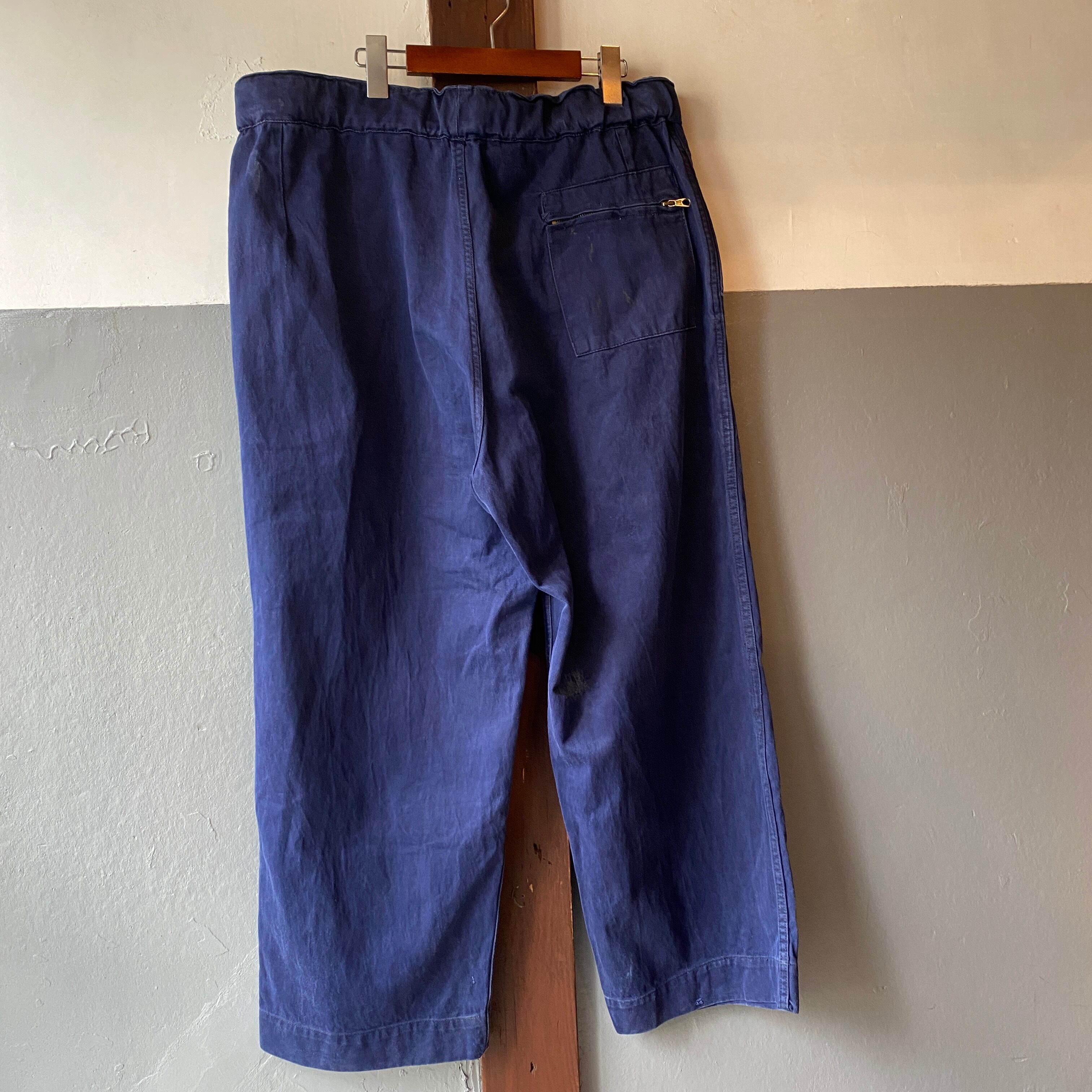 シンプルで簡素な作りですので戦闘用というよりはユーティリティ(雑務用)として使われていたパンツでスナップボタンがついたウエストベルトがついています。独特な光沢感を持ち、ネイビーブルーのハリのある生地感です。