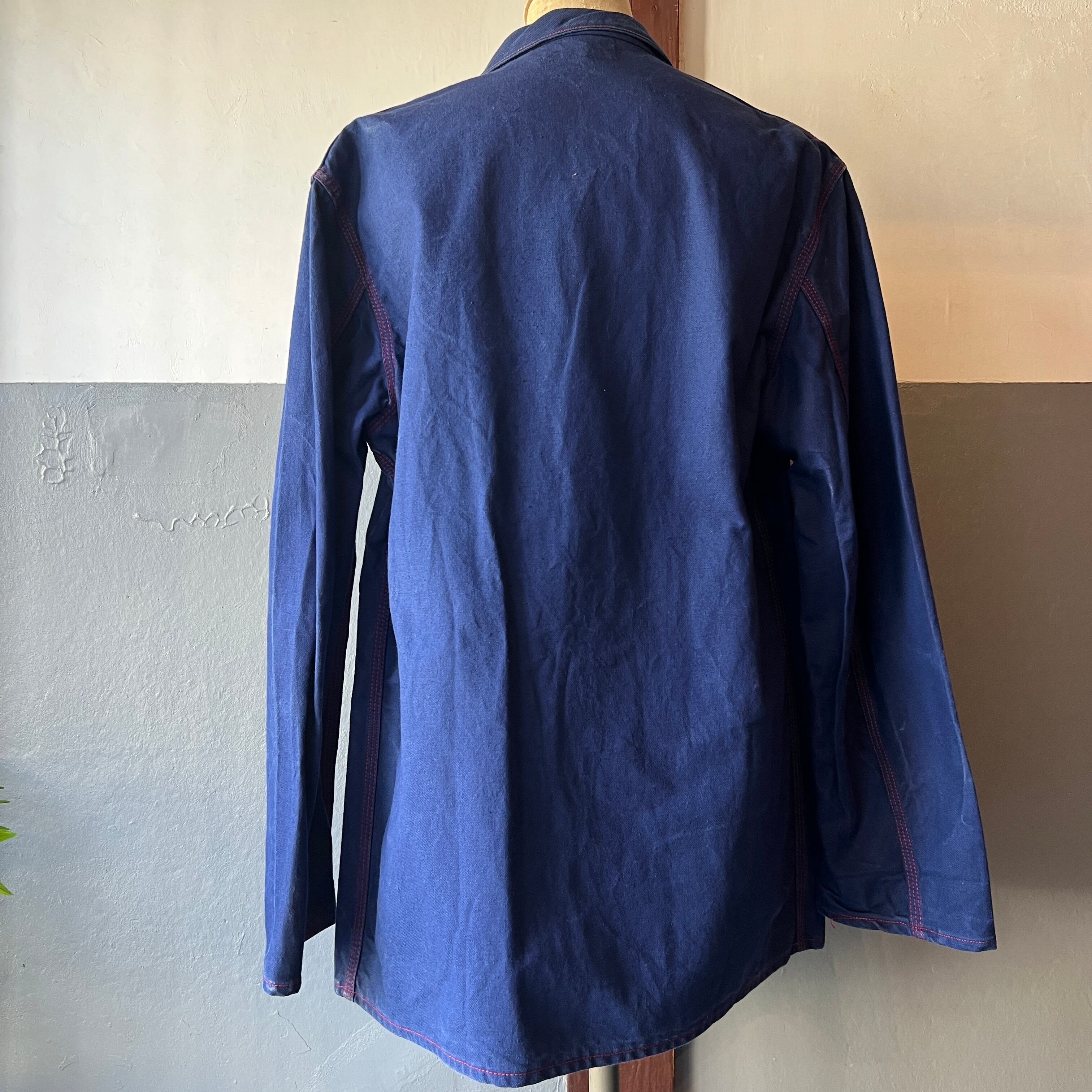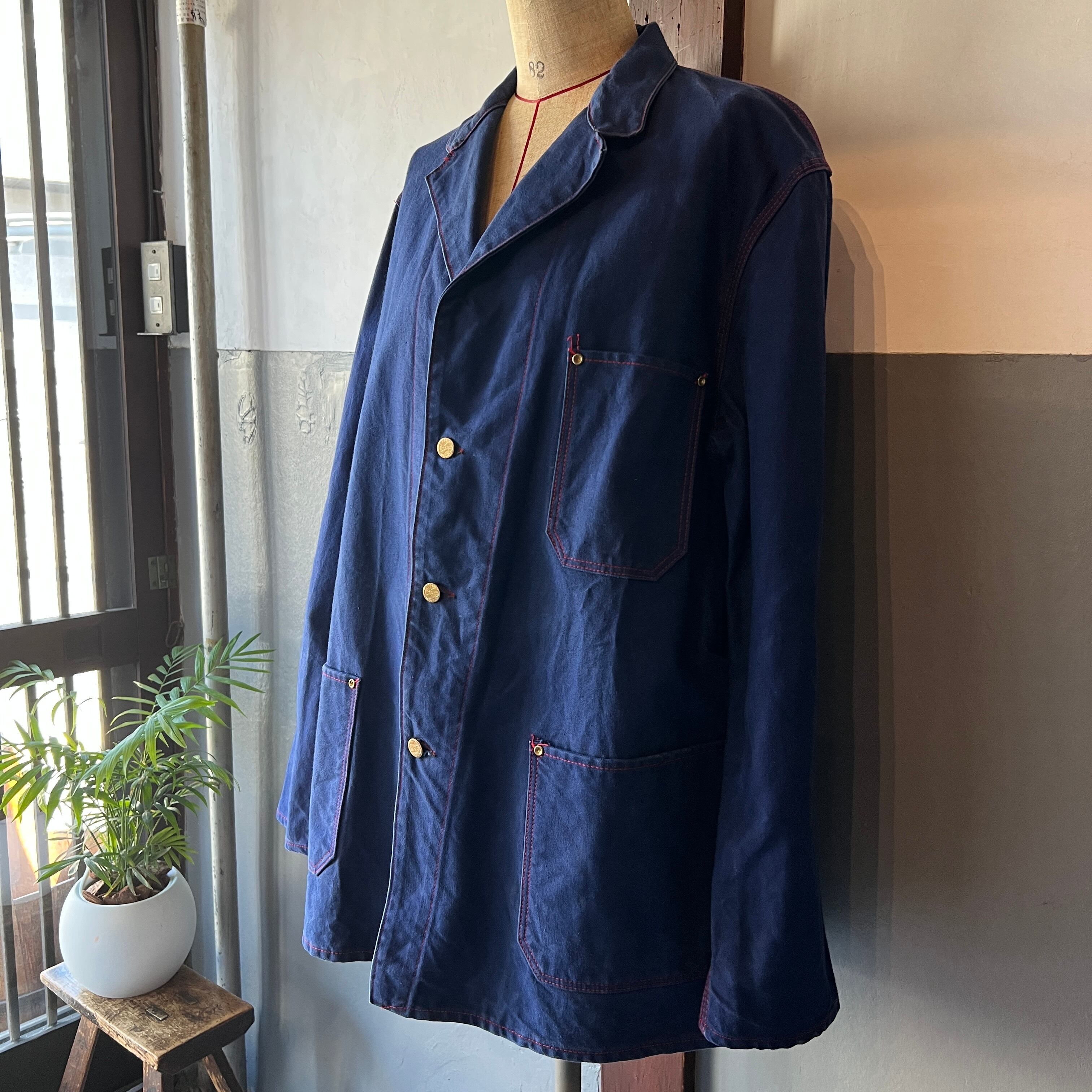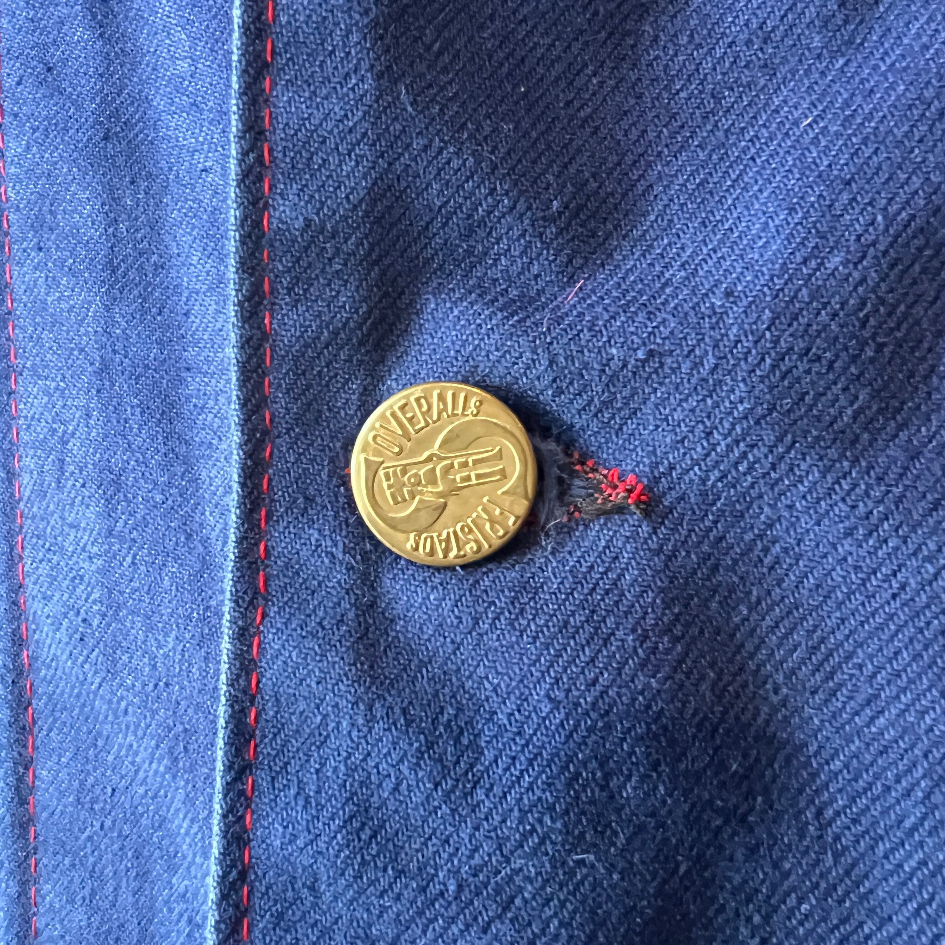 ゴールド色のボタンと赤のトリプルステッチが印象的なデザインです。