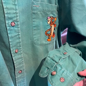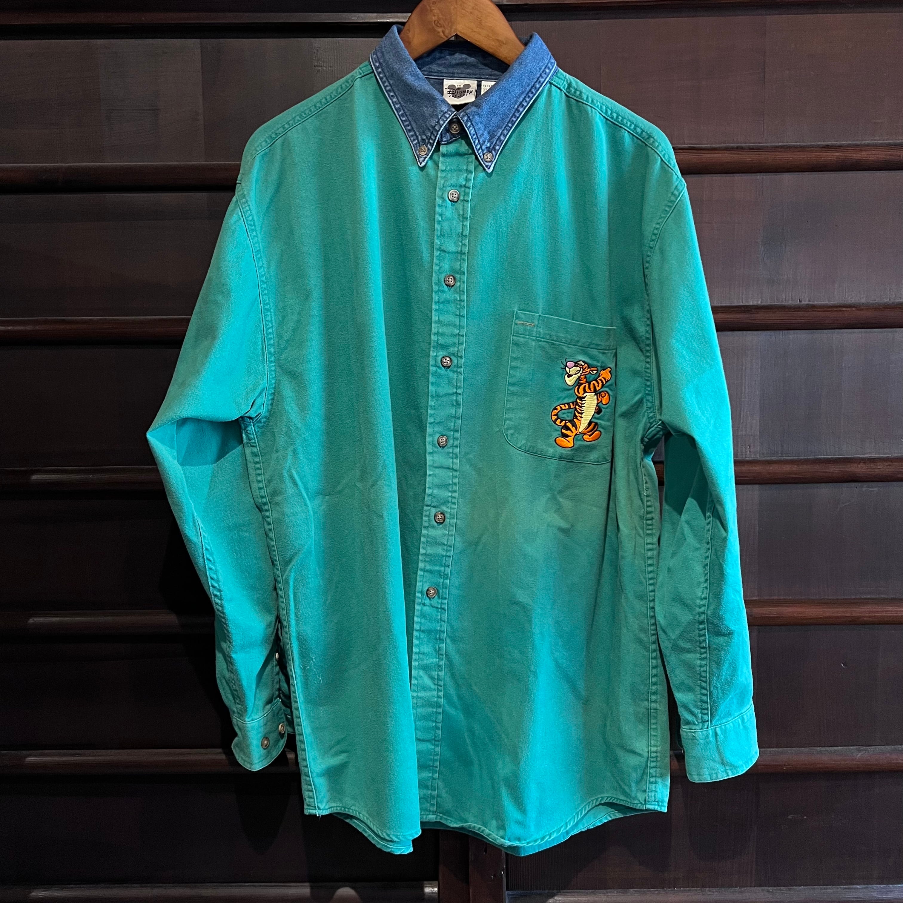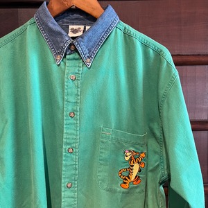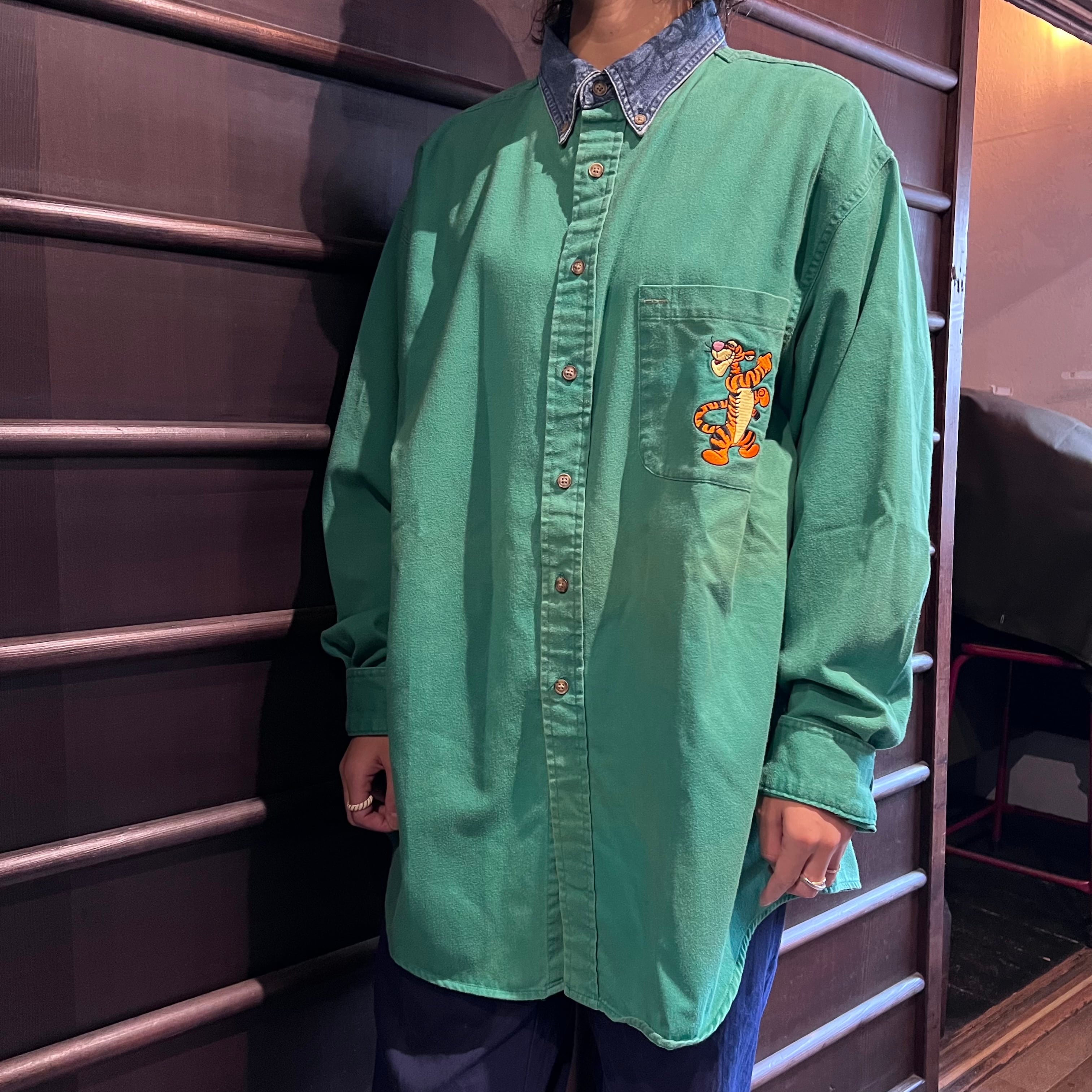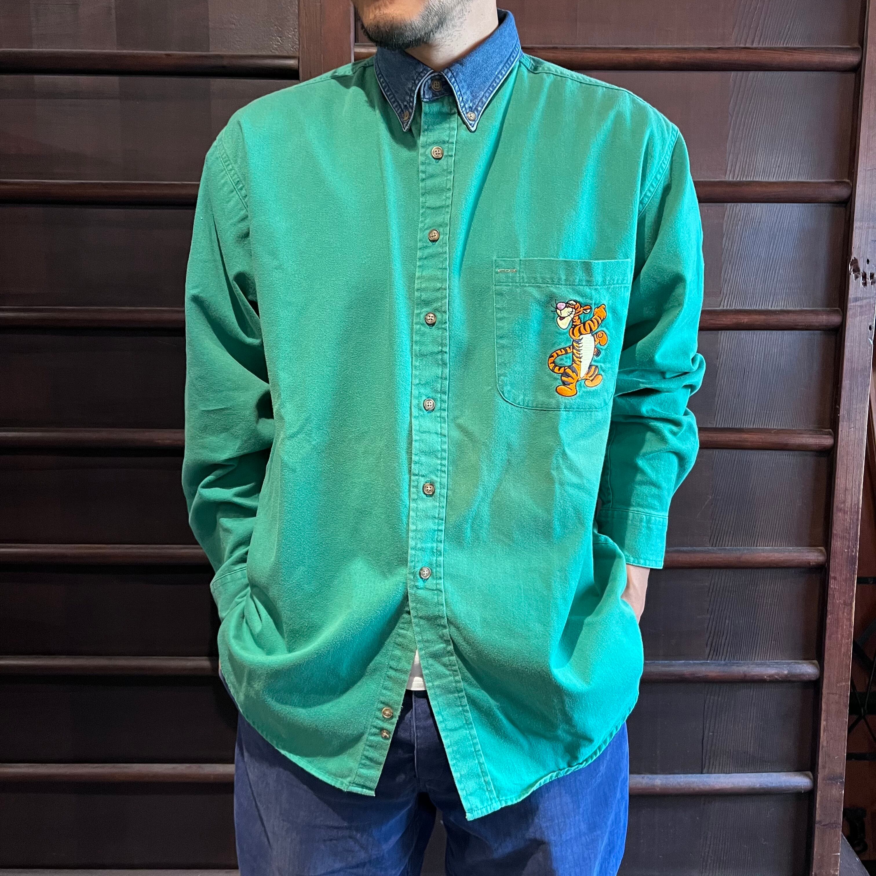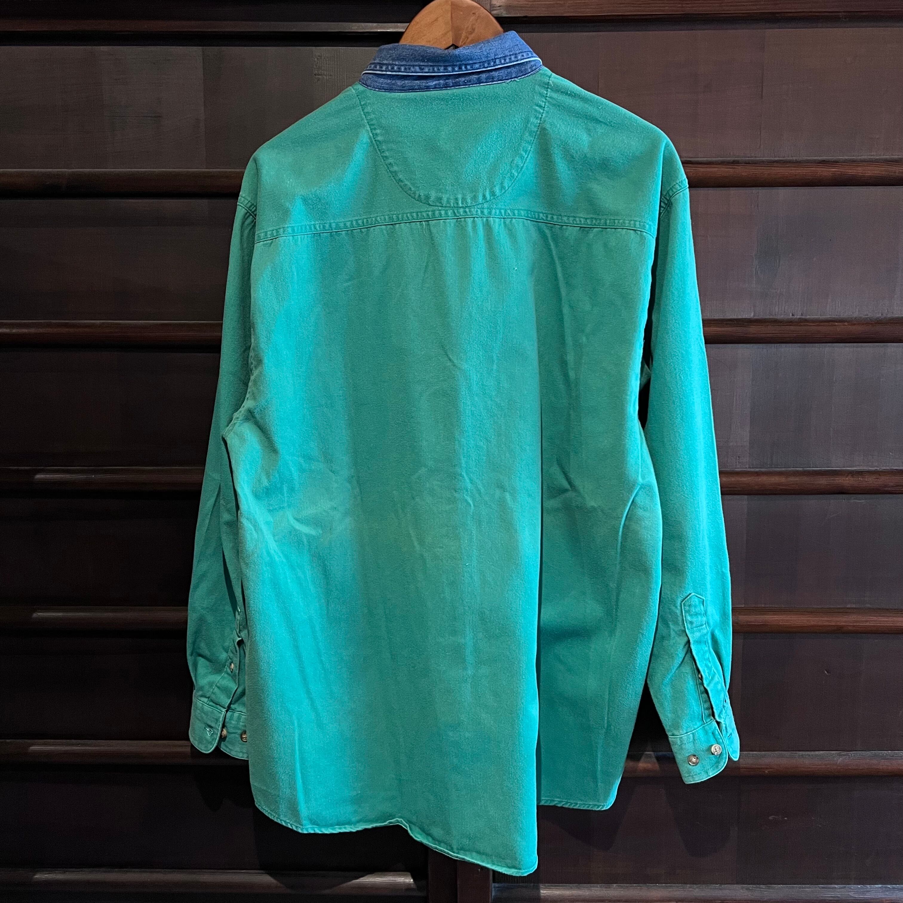 ベースがグリーンの襟元にデニムを使った珍しいデザインです。