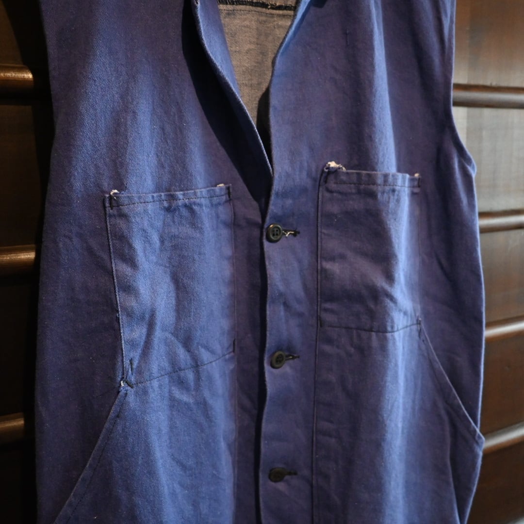 オリジナルのヨーロッパの作業服をリメイクした、一点もののベスト。古着ならではの味わいと、手作りのディテールを楽しめます。