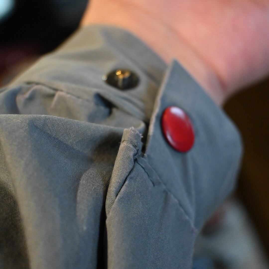 赤とグレーの配色。袖のスナップボタンに赤をもってきているところが個人的に好きなポイント。